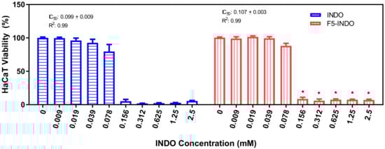 In vitro viability test in HaCaT cells (n = 9). T test determined statistically significant differences between free indomethacin (INDO) and F5-INDO formulations in different concentrations, (* p < 0.05).