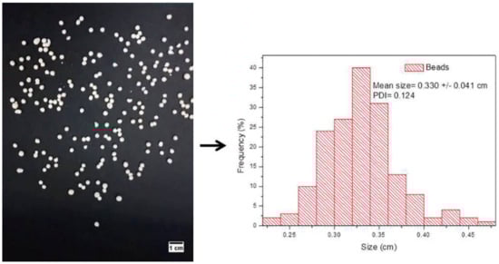 Frequency of size (cm) and distribution (PDI) of the prepared beads and nanobeads, obtained from digital photos and calculated by ImageJ software, n = 3.