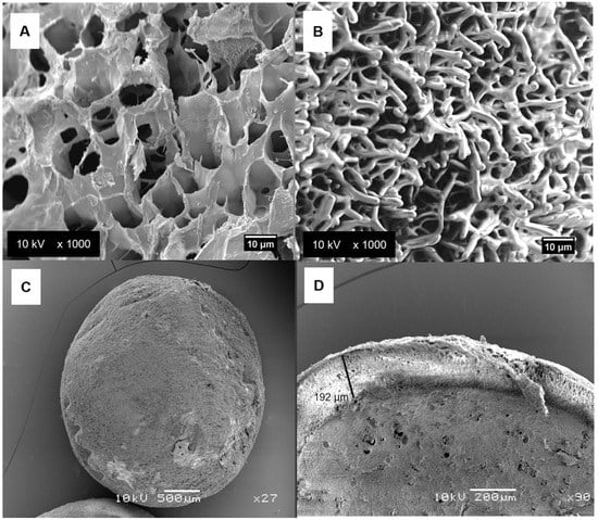 Figure 5 displays the surface analyses of the different bead and nanobeads loading 2% INDO. The CHT/INDO (Figure 5A) and CHT/NLC-INDO (Figure 5B) images showed expected profiles of the flake-like chitosan structure [21] and rough surface of biopolymer–lipid assembling [27], respectively. The top-of-view of CHT/NLC-INDO (Figure 5C) shows the spherical and uniform morphology of the nanobead. Finally, the cross-section of XAN@CHT/NLC-INDO (Figure 5D) nanobead proves the successful coating of XAN, with a well-delimited external layer with around 192 µm of thickness. There was no evidence of dispersed drug in the biopolymer matrices in any of the images.