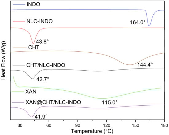The DSC thermodynamic profiles of the excipients and nanobeads are shown in Figure 6. Endothermic peaks corresponding to the melting points of INDO at 164.0 °C [28], NLC-INDO at 43.8 °C, CHT/NLC-INDO at 42.7 °C and XAN@CHT/NLC-INDO at 41.9 °C were detected. MM, in which melting point is at 36–42 °C [29], is the major component of NLC and nanobeads. In addition, two endothermic peaks, related to the biopolymers’ dehydration for CHT at 144.4 °C [30] and for XAN at 115.0 °C [15], were noticed.