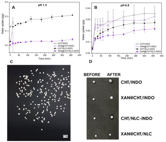 In vitro water uptake from beads and nanobeads in two different conditions: pH 1.2 (A) and pH 6.8 (B). Digital photos from the prepared samples (C) and the samples before and after the test (D) at pH 6.8 were provided. CHT/INDO = chitosan bead loading INDO 2% (w/v), XAN@CHT/INDO = xanthan-coated bead loading indomethacin 2% (w/v), CHT/NLC-INDO = nanobead loading indomethacin 2% (w/v), XAN@CHT/NLC-INDO = xanthan-coated CHT/NLC-INDO nanobead.