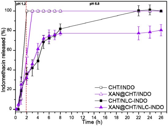 CHT/INDO and XAN@CHT/INDO beads exhibited burst effects, resulting in total (100%) INDO release in the second and third hour of the experiment, respectively. Differently, in the first 2 h of analysis, CHT/NLC-INDO and XAN@CHT/NLC-INDO nanobeads released around 36% and 31%, respectively. CHT/NLC-INDO released 100% of the anti-inflammatory after 22 h, while XAN@CHT/NLC-INDO released around 80% at the end of the experiment (26 h).