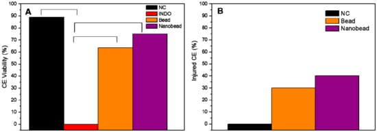 Finally, the safety of DDS is another mandatory requisite, especially in case of nanomaterials that exhibit novel kinetics and supramolecular arrangements, to detect possible risk factors to health [45]. In this sense, CE is an alternative toxicity model that is very promising to evaluate DDS, once different parameters (microscopical, microscopical and biochemical) are evaluated in a single model [31]. In here, the CE viability test showed that INDO solution (PC) killed all embryos after 24 h, which was not observed for bead and nanobead (Figure 9A) treatments. Moreover, the indexes of surviving embryos of NC did not show statistically significant differences (p > 0.05) compared to the groups treated with beads or nanobeads. In relation to the changes in the CE and annexes weight, significant differences among the groups and NC were not detected (p > 0.05).