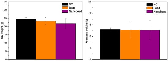 The weights of CE and annexes treated with NC, beads and nanobeads containing INDO (20 mg/egg) are given in Figure 10. In terms of CE weight, it was noticed values of 24.53, 23.31 and 21.71 g when treated with NC, beads and nanobeads, respectively. On the other hand, the weights of the annexes were 13.05, 12.82 and 12.68 g for NC, beads and nanobeads, respectively. There were no statistically significant differences among the CE (p > 0.05) and annexes (p > 0.05) weights in comparison with NC.