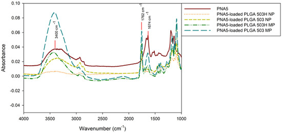 ATR FTIR molecular fingerprint spectra of pure PNA5 and PNA5-loaded particles are shown in Figure 2. The most typical spectra section for assessing peptide or protein-based drug secondary structure is the amide I area (1710–1590 cm−1) [24]. A band at 1634 cm−1 in PNA5 spectra can be observed and represents the acidic carbonyl C = O stretching, and the spectra of PLGA MP of both polymers is also observed, however, in PLGA NPs formulations, that band is not present suggesting most of the peptide is entrapped inside the particle and is masked by PLGA bands. The intense band observed at 1762 cm−1 is attributed to the stretching vibration of the carbonyl groups present in the two monomers. The bands in the spectra of all formulations show a wide and sharp band of an -OH group, at 3150–3650 cm−1 [25].
