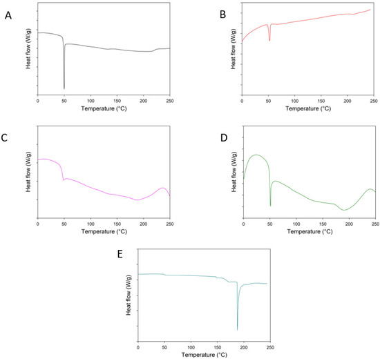 Differential scanning calorimetry (DSC) curves of Raw PNA5 glycopeptide and formulations: (A) 503 NPs, (B) 503H NPs, (C) 503 MPs, (D) 503H MPs, (E) Raw PNA5.