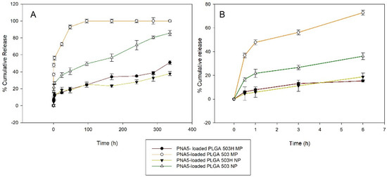 In vitro cumulative release of PNA5 glycopeptide over time from PLGA 503H and PLGA 503 polymeric nanoparticles and microparticles at pH = 7.4 and 37 °C. (A) 0–14 d; (B) 0–6 h.
