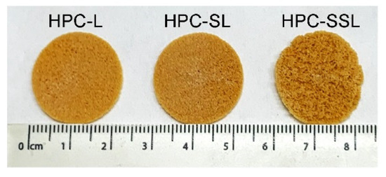 Images of itraconazole 3D printed discs using three different HPC grades (HPC-L, -SL, and -SSL, from left to right).