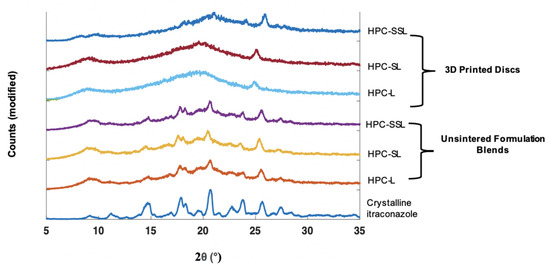 XRPD analysis was performed to observe if the polymer grade had an influence on the drug formation in the 3D printed discs. In the unsintered powders, characteristic diffraction peaks relating to crystalline itraconazole can be seen at 17.5°, 20.8°, and 24° 2 (Figure 2). In general, the SLS 3DP process was found to convert itraconazole from the crystalline to the amorphous form, indicated by the absence of diffraction peaks at the aforementioned angles; consistent with previous literature evaluating the use of direct powder extrusion (DPE) 3DP to formulate itraconazole-loaded formulations [11]. It was noted that 3D printed discs composed of HPC-SSL exhibited small diffraction peaks at 17.5° and 20.8°, indicating that itraconazole was retained in a partially crystalline form, which may have been due to unsintered powder material being retained on the printlet surface or pores, as found elsewhere [23,44,45].