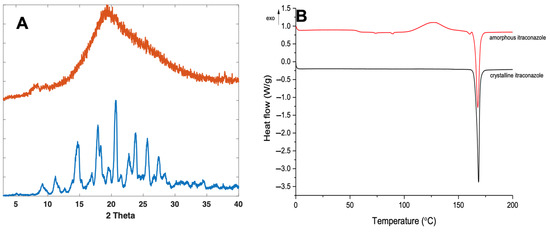Crystalline itraconazole displayed characteristic XRPD diffraction peaks at 14.7°, 17.5°, 20.8°, 24°, 25.8°, and 27.5° 2 (Figure 3A), consistent with form 1 as reported elsewhere [46,47]. Formation of amorphous itraconazole post quench cooling was confirmed by the presence of a broad halo in the XRPD diffractogram, with no characteristic Bragg’s diffraction peaks corresponding with the crystalline form (Figure 3A).
