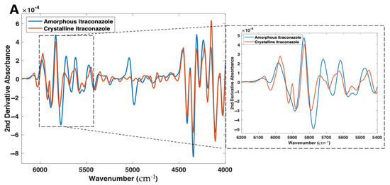 Differences in the NIR and Raman spectra were observed between the crystalline and amorphous forms (Figure 4A,B). With NIR spectroscopy, spectral changes, due to the solid state could be seen throughout the 4000–6200 cm−1 wavenumber range (Figure 4A). Most notably, the peaks at 5800–5900 cm−1, which represent the first overtone vibrations of the -C-H functional groups [53], exhibit a distinct morphology for the crystalline form (double peak), compared with its amorphous form (single broad peak). At the peak located at 5800 cm−1 for the crystalline material, an increase in peak intensity, as well as a peak shift to 5775 cm−1, is observed for the amorphous form. The peak at ~5000 cm−1 for amorphous itraconazole is attributed to the presence of water [54], likely due to its higher hygroscopicity compared with the crystalline form [55] and, as such, the region 4800–5200 cm−1 was excluded from the subsequent multivariate analysis.