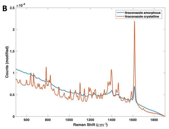For Raman spectroscopy, the PLS regression model was based on a previously reported method for itraconazole crystallinity quantification [67] (Figure 7B). First, the regions between 1000 and 1700 cm−1 were selected, followed by a Whittaker baseline correction (smoothness factor = 100,000 and p = asymmetry factor 0.001) and a normalisation to the area of peak 1614 cm−1 and mean-centering pre-processing method were used. The developed PLS model had a high linearity (R2 = 0.998) and an accuracy of 0.63%, indicated by the RMSEP value (Figure 7B). The specificity was high for solid state changes, indicated by an LV1 value of 86.31%.