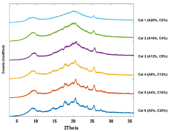 XRPD diffractograms of itraconazole calibration samples 1–6 (Cal 1–6).