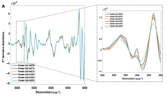 First, the calibration samples (Cal 1–6) were scanned using NIR and Raman spectroscopy (Figure 6A,B). With NIR spectroscopy, a change in peak morphology and intensity occurred as a function of crystalline content, even in the presence of a high polymer concentration (77% w/w) (Figure 6A). With Raman spectroscopy, consistent with the amorphous and crystalline spectra, as the sample amorphous content increased, the peak intensities across 700–1700 cm−1 were found to decrease, and the peak morphologies broadened (Figure 6B).