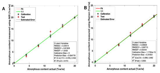 Two calibration models were developed using PLS regression for calibration samples scanned using both NIR and Raman spectroscopy (Figure 7A,B).