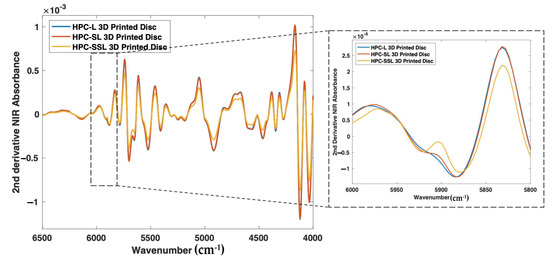 2nd derivative NIR spectra (filter width of 21, 2nd polynomial) of itraconazole-loaded 3D printed discs.