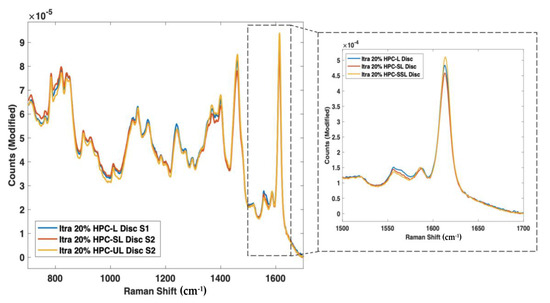 As such, nine 3D printed discs (3 polymer grades: HPC-SSL, HPC-SL, and HPC-L; n = 3) were scanned using both NIR and Raman spectroscopy setups. For NIR spectroscopy, the results showed a similar trend in the change in peak morphology and intensity at 5800–5900 cm−1, initially indicating its potential suitability for use in the calibration model (Figure 8). As seen previously, the low molecular weight HPC grade (HPC-SSL) exhibited a double peak morphology, suggesting a higher degree is present in the crystalline form, which was in alignment with the previous findings from XRPD (Figure 2). For Raman spectroscopy, the results were consistent with this finding, indicated by the increase in peak intensity at 1614 cm−1 for HPC-SSL compared with HPC-L and -SL formulations (Figure 9).