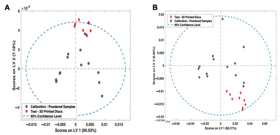 LV1 vs. LV2 Scores plot for the (A) NIR spectroscopy PLS model and (B) Raman spectroscopy PLS model. Grey points = calibration samples; red points = 3D printed discs.
