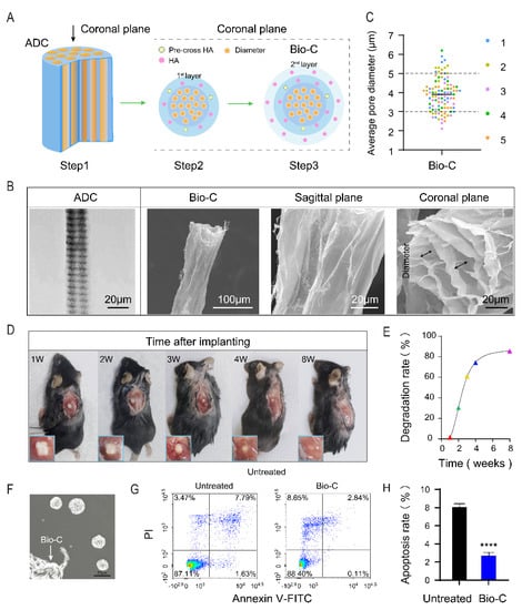 Characterization of Bio-C. (A) Schematic representation of Bio-C construction. (Step1) Bio-C constructed by the acid-desalted-collagen (ADC) and two outer HMW-HA layers. (Step 2) surface modification of purified ADC, using pre-crossed HMW-HA/and hydrated HMW sodium hyaluronate mixture to form first layer. (Step 3) Deposition of second layers of hydrated HMW sodium hyaluronate. (B) Electron micrographs of Bio-C scaffolds. TEM image showing ADC fiber at the core of Bio-C, maintaining collagen fibril structural integrity by periodic stripes with alternating light and dark shades (left). SEM image showing the morphology of Bio-C in sagittal plane and coronal plane (middle and right). (C) Statistical diagram showing the range of average pore diameters (arrow in B) from five batches of Bio-C. Over 70% of the samples carrying averaged pore sizes ranging between 3 and 5 μm. (D) Biodegradation and biocompatibility of Bio-C in vivo. Animals with Bio-C implants demonstrating different levels of material degradation from 1 week to 8 weeks. Enlarged images demonstrating mice with Bio-C implantations in the back muscle did not show signs of tissue rejection. (E) Degradation curve of Bio-C in vivo. The diagram revealed degradation kinetics of Bio-C from less than 10% at 1 week to over 85% at 8 weeks. (F) Morphology of neurospheres cultured in the presence of Bio-C. (G) NSCs apoptosis rates detected by PI/FITC-annexin V along combining with flow cytometric analysis. (H) Statistical diagram showing NSCs apoptosis rates with or without Bio-C. (**** p < 0.0001 significantly different from untreated control. Unpaired t-test. Data are presented as the mean ± SD.)
