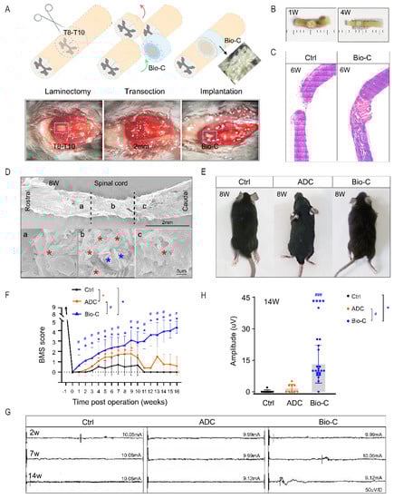 Bio-C promoted regeneration and functional recovery after complete SCI. (A) Schematic illustration of complete transection and segment removal SCI model (upper panel) and images of mice complete transection surgery (lower panels), in which a T8–T10 thoracic spine was open (laminectomy) and 2 mm–segment spinal-cord tissue was removed (transection), followed by immediate Bio-C or ADC implantation in the lesion area (implantation). (B) Freshly dissected spinal-cord tissue with Bio-C implants isolated in 1 week (left) and 4 weeks (right) after SCI. (C) Images of HE staining showing the difference of spinal-cord morphology with and without Bio-C implants at the 6 weeks after SCI. (D) Scanning electron micrographs showing spinal cord with Bio-C implants at 8 weeks after SCI. Red star indicates spinal-cord tissues, and blue star indicates Bio-C residue in tissue. (E) Different hind-limb recoveries in SCI (control), ADC, and Bio-C groups at 8 weeks after surgery. (F) Statistical diagram showing animal hind-limb motor-functional recovery after SCI in BMS open-field test (mean ± SEM; blue # indicates the difference between Bio-C and ADC mice; blue * indicates differences between Bio-C and SCI mice; orange * indicates differences between ADC and SCI mice; *# p < 0.05, N ≥ 165, n ≥ 3 unpaired Student’s t-test with comparisons of all three groups at each time point, up to 16 weeks). (G) Electrophysiological analysis of SCI mice with and without ADC and Bio-C implants at 2, 7, and 14 weeks after SCI. Schematic graph to show the MEP recording and representative MEP traces. Note that only the Bio-C group showed partial recovery at 14 weeks. (H) Statistics diagram showing significant MEP amplitude differences among SCI/control, ADC, and Bio-C groups at 14 weeks after SCI. (Mean ± SEM, n ≥ 3; **** p < 0.0001, and ### p < 0.001; unpaired Student’s t-test.) Both SCI and ADC groups had little MEP signals.