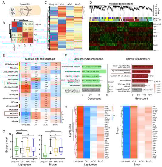 RNA-Seq analysis uncovered molecular mechanisms for better functional recovery in SCI mice with Bio-C implants. (A) Total RNA was collected from 2 mm segments of spinal cord surrounding the epicenter of the lesion. (B) Pairwise Pearson correlation amongst all sample groups (uninjured normal mice, injured control mice, and SCI mice with ADC or Bio-C implants). (C) Cluster thermogram of differentially expressed genes among sample groups (uninjured normal mice, injured control mice, and SCI mice with ADC or Bio-C implants). (D) WGCNA Dendritic Trees and Heatmap of significantly differentially expressed genes among sample groups before/after SCI and with the ADC or Bio-C implants. (E) Module–trait correlation analysis revealed dynamic changes of sixteen modules under different conditions. (F) GO analysis reveals the neurogenesis related “Light green” module and the inflammatory-related “Brown” module among 16 modules associated with the effect of Bio-C on SCI repair. (G) Box-plots of all hub genes in “Light green” module (87 hub genes) and “Brown” module (93 hub genes) (mean ± SEM, n ≥ 3; **** p < 0.0001, *** p < 0.001, ** p < 0.01, and * p < 0.05; unpaired Student’s t-test). (H) Heatmap of the top 30 hub genes according to “Light green” module and “Brown” module among uninjured normal mice, SCI control mice, and SCI mice with ADC and/or Bio-C implants.