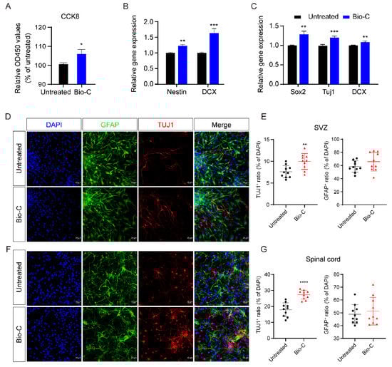 Bio-C improved NSCs growth and enhanced NSCs differentiation into neurons in vitro. (A) Viabilities of NSCs were detected by using “cell proliferation and cytotoxicity kit-8” (CCK8). (B) The mRNA expressions of Nestin (an undifferentiated NSC marker) and DCX (a newly differentiated neuronal marker) were measured by RT-qPCR. (C) The mRNA expressions of Sox2, Tuj1, and DCX (newly differentiated neuronal markers) were measured by RT-qPCR after 7 days of spontaneous differentiation culture. (D) Representative fields of GFAP and Tuj1 immunofluorescence staining of NSCs treated with Bio-C after 7 days of spontaneous differentiation. (E) Statistical analyses of (D) showing the ratios of Tuj1+/DAPI+ cells or GFAP+/DAPI+ in NSCs with or without Bio-C. (F) Representative fields of GFAP and Tuj1 immunofluorescence staining of sNSCs treated with Bio-C after 7 days of spontaneous differentiation. (G) Statistics analysis of (F), showing the ratios of Tuj1+/DAPI+ or GFAP+/DAPI+ cells in NSCs with or without Bio-C. NSCs were isolated from the SVZ of 4 weeks mice. sNSCs were isolated from the spinal cord of neonatal mice (postnatal day 1). (Note: **** p < 0.0001, *** p < 0.001, ** p < 0.01, and * p < 0.05; mean ± SEM, n ≥ 3; unpaired Student’s t-test.)