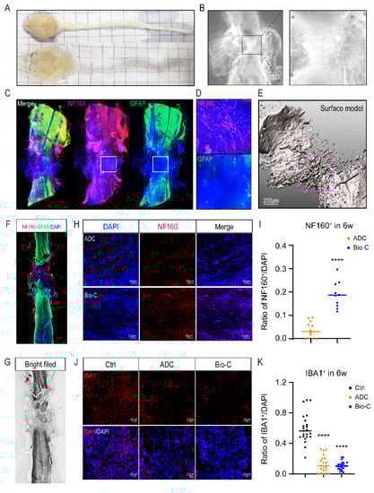 Bio-C increased NF160+ cell number and decreased IBA1+ cell number at 6 weeks after SCI. (A) Appearance of brain and spinal-cord tissues before and after CUBIC-clearing process. (B) Left: Bright field image showing spinal-cord tissue with Bio-C implants after clearing by using the CUBIC method. Right: a magnified image of the indicated area (the rectangle) in left. (C): The reconstituted 3D image showing distribution of NF160+ (red) and GFAP+ (green) cells in Bio-C implants at 6 weeks after SCI. (D) Magnified images of the indicated area (rectangles) in (C), showing plenty of NF160+ and DAPI+ but rarely GFAP+ distribution in the lesion/regeneration area. (E) Three-dimensional surface reconstruction of NF160+ fiber from (B), using Imaris software. (F) Representative fields of NF160 and GFAP immunofluorescence staining of tissue sections from spinal-cord segments with Bio-C implants. (G) Bright field image of (F). (H) Representative fields of NF160 immunofluorescence staining in lesion area with ADC and Bio-C implants. (I) Quantitative analyses of immunofluorescence showing the ratio of NF160+/DAPI+ cells in (H) (mean ± SEM, n ≥ 3, **** p < 0.0001, comparing Bio-C group to ADC group). (J) Representative fields of IBA1 immunofluorescence staining in lesion/regeneration area in SCI/control, and SCI with ADC or Bio-C implants. (K) Quantitative analyses of immunofluorescence, showing the ratio of NF160+/DAPI+ cells in (J) (mean ± SEM, n ≥ 3, **** p < 0.0001, comparing Bio-C group and ADC group to injured control group).