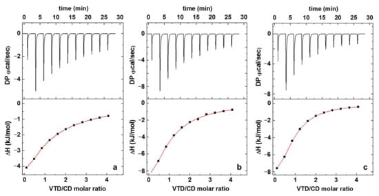 Calorimetric titrations were carried out in order to verify the formation of host–guest complexes between VTD and CDs. Figure 2 shows the heat evolved and the curve fitting the enthalpy of complex formation for the three studied systems. Table 1 shows the thermodynamic parameters obtained.