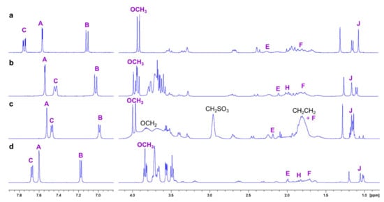 High frequency (left) and low frequency (right) regions of the 1H-NMR spectra (0.1% DCl in D2O, 500 MHz, 298 K) of: (a) VTD, (b) VTD:β-CD, (c) VTD:SBCD, and (d) VTD:γ-CD. The VTD protons are identified in violet and the SBCD spacer protons in black (see Figure 1). For the assignment of the other cyclodextrin protons please see Figure 4, Figure 5 and Figure 6.