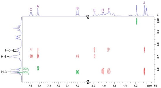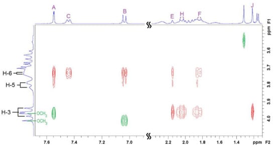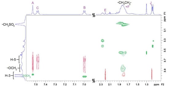 In the case of the VTD:SBCD inclusion complex (Figure 5), the ROESY spectrum showed a similar cross-peak pattern to VTD:β-CD and thus indicates a comparable inclusion geometry. Besides the steroid/H-3 and the aromatic/H-5 cross-peaks, the spectrum reveals spatial vicinity between the aromatic protons and the OCH2 protons of the sulfobutyl group located on the primary side [34], although we could not detect cross-peaks with the VTD methoxy groups due to signal overlap. No interactions with the other sulfobutyl methylene groups were observed.