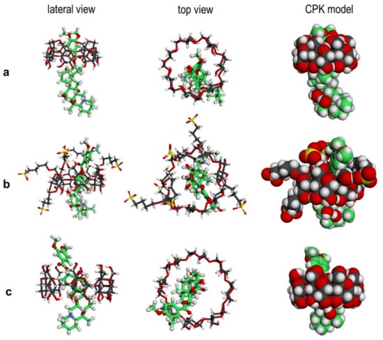 Molecular docking is a widely used tool that aids to understand the geometries and interactions involved in the formation of inclusion complexes and often complements the experimental results [35]. From the simulation results presented in Table 2 we observe that all three CDs are predicted to be potential binders for the VTD. From docking, we obtained −25.9 kJ/mol, −26.7 kJ/mol and −5.6 kJ/mol for SBCD, γ-CD and β-CD, respectively. These results are in agreement with the experimental results obtained by ITC, where SBCD and γ-CD are stronger binders for VTD than β-CD. From the 3D structures we can see that the best pose for the VTD:β-CD complex (Figure 7a) is one where the VTD molecule is not completely introduced inside the β-CD cavity. The aromatic ring is located inside the cavity and most of the steroid part of the molecule lies outside the cavity. In the case of SBCD (Figure 7b), although it is a β-CD derivative, the host has an elongated cavity because of the presence of the sulfobutyl ether arms that create more space for the guest, resulting in more penetration of VTD. Additionally, its anionic character may help to further stabilize the inclusion complex by electrostatic interactions with the protonated nitrogen atom present in the steroid part. On the other hand, the best pose of the VTD complex with the larger γ-CD host (Figure 7c) shows that the guest is deeply introduced inside the cavity and that the aromatic ring actually protrudes from the primary side. This results in a sort of pseudorotaxane structure in which the host cavity mainly interacts with the steroid part. As can be seen, the docking results are in good agreement with the 2D-ROESY NMR experiments, confirming the validity of this tool to understand inclusion complexation in cyclodextrins.