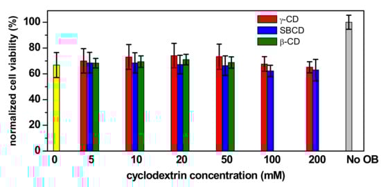In our experiments, the pre-treatment of the Neuro-2a cells with 0.4 mM OB resulted in around a 30–40% decrease in cell viability (Figure 9). The effect of CDs on the Neuro-2a cells was simultaneously evaluated. Cells were exposed to different CDs concentrations up to 50 mM, in the case of β-CD (higher concentrations could not be tested because of the low solubility of this CD), and up to 200 mM for γ-CD and SBCD. Cell viabilities around 60–70% were obtained in the absence (0 mM CD) and in the presence of all CDs and at all studied concentrations, demonstrating that CDs are harmless to Neuro-2a cells. On the other hand, this experiment also suggests that the CDs do not form host–guest complexes with OB. This is not surprising, since OB is the glycoside of a pentahydroxylated steroid and thus a highly polar and hydrophilic molecule with little or no affinity for the CDs.