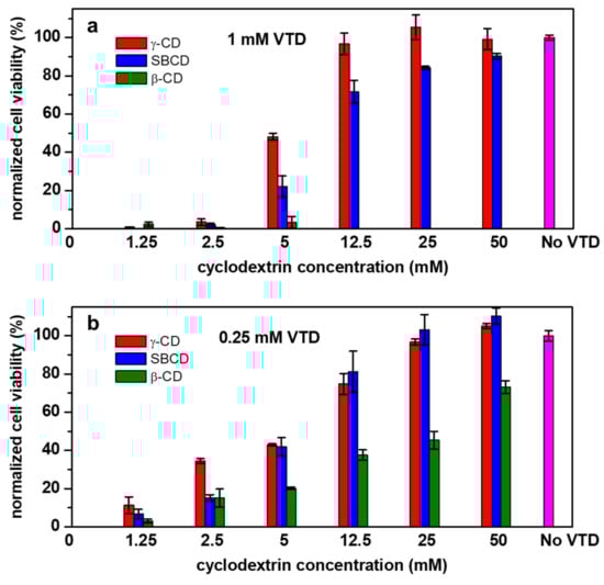 Experiments were then performed using 0.25 mM VTD. In this case, all CDs were able to neutralize the toxic effect of VTD totally or partially, again in a concentration-dependent manner (Figure 10b). As expected, lower CDs concentrations are needed to inhibit the VTD toxicity. In the case of β-CD, even though a higher concentration (compared to γ-CD and SBCD) is required to inhibit the VTD toxicity, 70% cell viability recovery is achieved at the highest tested β-CD concentration of 50 mM. Therefore, the three studied CDs have antidote-like characteristics, which depend on the type of CD as well as on VTD and CD concentrations.