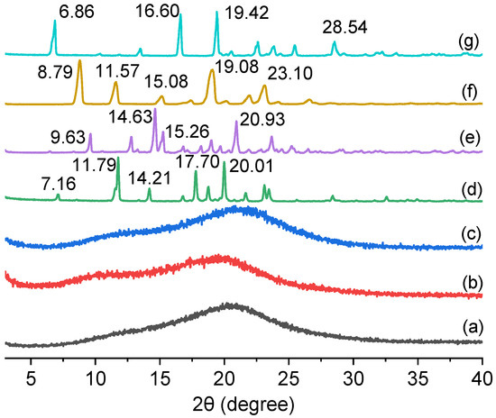 The PXRD patterns of co-amorphous forms of MAR-RES (a), OMAR-RES (b), and SPD-RES (c), as well as crystalline forms of matrine (d), oxymatrine (e), sophoridine (f), and resveratrol (g).