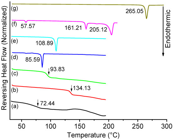 The mDSC curves of co-amorphous forms of MAR-RES (a), OMAR-RES (b), and SPD-RES (c), as well as crystalline forms of matrine (d), oxymatrine (e), sophoridine (f), and resveratrol (g).