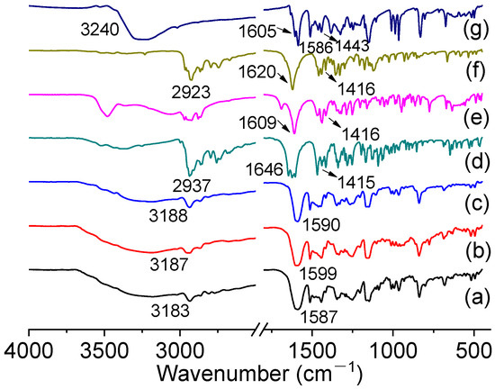 The FTIR spectra of co-amorphous forms of MAR-RES (a), OMAR-RES (b), and SPD-RES (c), as well as crystalline forms of matrine (d), oxymatrine (e), sophoridine (f), and resveratrol (g).