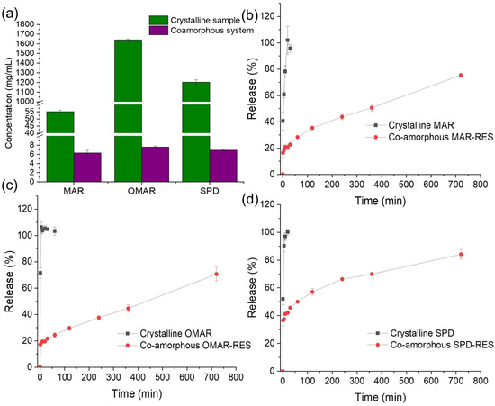 Equilibrium solubilities of matrine, oxymatrine, and sophoridine from their crystalline and co-amorphous forms (a); release profiles of MAR from crystalline MAR and co-amorphous MAR-RES (b); OMAR from crystalline OMAR and co-amorphous OMAR-RES (c); SPD from crystalline SPD, and co-amorphous SPD-RES (d) in pH 6.8 PBS at 37 ± 0.5 °C.