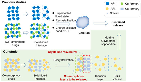 The proposed sustained-release mechanism for co-amorphous matrine/oxymatrine/sophoridine and resveratrol, in comparison to previously reported gelation-based release mechanism.