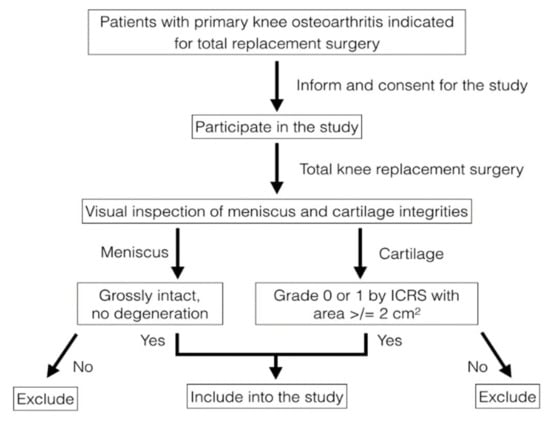 Flowchart of the sample collection. The menisci and femoral condyles of the patients who met the criteria and volunteered to join the study were visually inspected; only patients who had non-degenerative meniscus and spared at least 2 cm2 of grade 0 and 1 cartilage by ICRS grading were included in the study.