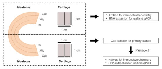 Immediately prior to the histological study and cell isolation, the samples were prepared as shown in Figure 2. All of the synovial tissues were removed and washed with phosphate-buffered saline (PBS, Sigma-Aldrich, St. Louis, MO, USA). The femoral condyles were washed and examined in order to identify areas that presented as grade 0 or 1 according to the International Cartilage Repair Society grading [21]. From the superficial through to just above the calcified zone, the cartilage was harvested using a scalpel; cartilage pieces were gathered to obtain 2 cm2 in total. Individual menisci were cut radially at mid-body; one half was used for immunohistochemistry and ribonucleic acid (RNA) extraction, and the other half proceeded to cell isolation and then primary culture. In the same way, the cartilage pieces were equally divided, 1 cm2 for native tissue analysis and 1 cm2 for the cell culture.