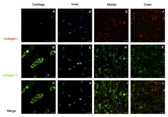 Collagen I and collagen II staining of the native tissues. Immunofluorescent localized type I and II collagen in human cartilage and meniscus. Positive staining of Col II in the pericellular matrix was observed in the cartilage, which was called chondron (B,C), and was scantly demonstrated in the meniscus (arrows in (E,H,K)). Collagen I staining presented in middle and outer meniscus (G,J and K) but absented in cartilage and inner meniscus (A,D). The co-localization of Col I and Col II were displayed in the middle and outer meniscus (arrow heads in I and L). In the merged channel, the inner and middle meniscus presented toward chondrogenic staining (F,I), whereas the outer meniscus showed more fibrogenic-like staining (L). Scale bars: 25 µm.