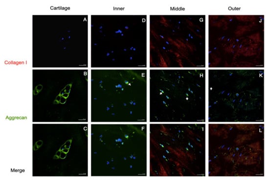 Collagen I and aggrecan staining of native tissues. Immunofluorescent localized Col I and Agg in human cartilage and meniscus. No positive staining of Col I was seen in the cartilage (A), but a tiny stain was exhibited in the inner meniscus (arrowhead in (D)); apparently, Col I staining was detected in the middle and outer parts (G,J). The Agg staining obviously presented the pericellular matrix of the cartilage (B,C), and was scarcely displayed in three areas of the meniscus (arrows in (E,F,H,I,K,L)). Scale bars: 25 µm.