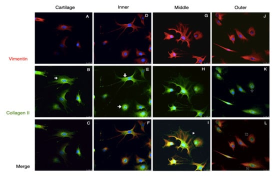 Collagen II and vimentin staining of the passage 2 cultured cells. Immunofluorescence demonstrated the vimentin and Col II staining of passage 2 cultured cells from the cartilage and meniscus. Two distinct cell morphologies were demonstrated in the meniscus. Vimentin staining presented a cytoskeletal-like pattern (A,D,G,J). Col II in the cartilage and inner cells exhibited fine mesh-like patterns, particularly in the cytosol (arrows in (B,E)), but cells from the middle meniscus had overspread Col II from the cytoplasm along to the cells’ process (arrowheads in (H)) whereas Col II in the outer meniscus cells was limited in the perinuclei area (hollow arrows in (K)). In the merged channel, inner and middle meniscus presented both chondrogenic and fibrogenic staining (F,I), whereas the outer meniscus cells showed more fibrogenic-like staining (L) and chondrocyte demonstrated chondrogenic staning (C). Scale bars: 25 µm.