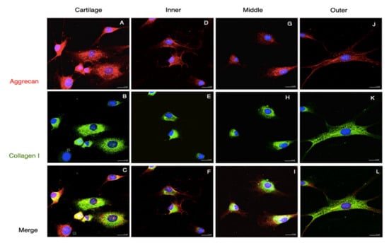 Collagen I and aggrecan staining of passage 2 cultured cells. Immunofluorescence demonstrated the Agg and Col I staining of passage 2 cultured cells from the cartilage and meniscus. Agg staining displayed punctuate patterns scattered in the cells (arrow in (A,C,D,F,G,I,J,L)), whereas Col I staining was mostly found around the nuclei (arrowheads in (B,E,H)). Some cells from the cartilage were absent of Col I staining (hollow arrows in (B)). And cells from outer meniscus clearly presented Col I staining (K,L). Scale bars: 25 µm.