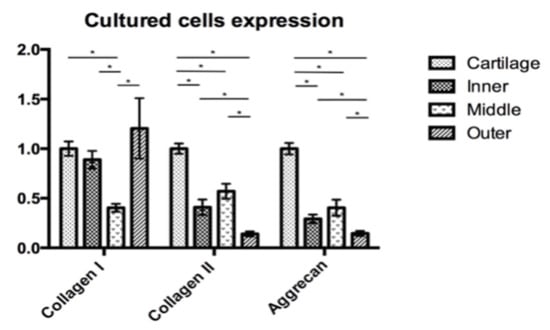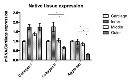 Native cartilage and meniscus tissue expression with the COL1A1, COL2A1 and ACAN gene expression of the meniscus is presented in comparison to the cartilage gene expression. The expression of COL2A1 was higher in the cartilage and inner meniscus compared to the outer meniscus, but there were no significant differences between the cartilage and the inner and middle meniscus. For ACAN, the outer meniscus had the lowest expression, and there were no significant differences among the other three groups. *: p-value < 0.05.