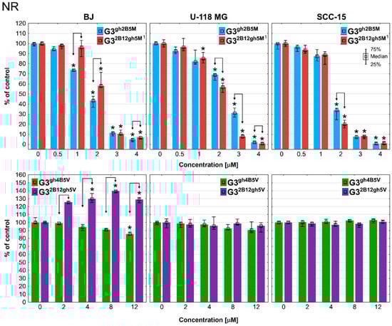 Cytotoxic effect of dendrimers conjugated via ester or amide bond with αM (G3gh2B5M and G32B12gh5M) and V (G3gh4B5V and G32B12gh5V) after 48 h of incubation with normal fibroblasts (BJ), glioblastoma cells (U-118 MG), and squamous carcinoma cells (SCC-15), estimated with the NR assay. Cell viability (expressed as percent of the non-treated control) medians are plotted. The whiskers are lower (25%) and upper (75%) quartile ranges. * p ≤ 0.05; Kruskal-Wallis test (against non-treated control), ↕ p ≤ 0.05; Mann-Whitney U test (ester against amide-attached drug-conjugate). 1 Data for G32B12gh5M were reproduced from [29].