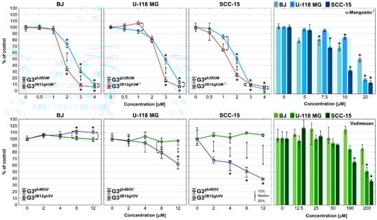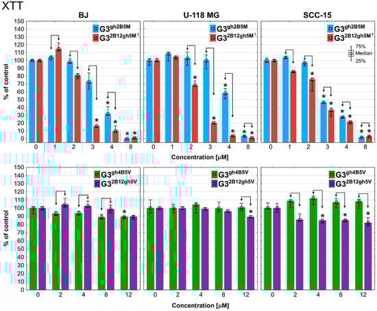 Viability of normal fibroblasts (BJ), glioblastoma cells (U-118 MG) and squamous carcinoma cells (SCC-15) after 48 h of incubation with G3gh2B5M, G32B12gh5M, G3gh4B5V and G32B12gh5V, assessed by XTT assay. Cells viability (expressed as percent of the non-treated control) medians are plotted. The whiskers are lower (25%) and upper (75%) quartile ranges. * p ≤ 0.05; Kruskal-Wallis test (against non-treated control), ↕ p ≤ 0.05; Mann-Whitney U test (ester- against amide-attached drug-conjugate). 1 Data for G32B12gh5M were reproduced from [29].