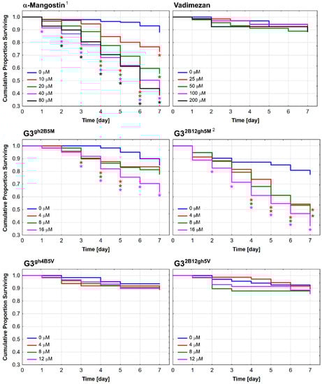 The Kaplan-Meier survival curves of C. elegans after 7 days of incubation with αM, V, G3gh2B5M, G32B12gh5M, G3gh4B5V or G32B12gh5V. Results are presented as cumulative proportion surviving. Statistically significant differences against dmso-treated control obtained in Gehan’s Wilcoxon test are marked with asterisks * (p ≤ 0.05) in the colours corresponding to the tested concentrations. 1,2 Data for αM and G32B12gh5M conjugate were reproduced from [2,29], respectively.
