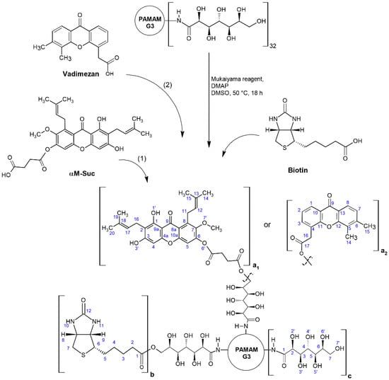 Synthesis of PAMAM G3gh dendrimer conjugates with α-mangostin (1) or vadimezan (2), and biotin attached via ester bond: (1) G3gh2B5M (a1 = 5, a2 = 0, b = 2, c = 25), (2) G3gh4B5V (a1 = 0, a2 = 5, b = 4, c = 23).