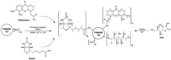 Synthesis pathway of PAMAM G3 dendrimer substituted with vadimezan, biotin and α-D-glucoheptono-1,4-lactone attached via amide bond: G32B12gh5V (a = 5, b = 2, c = 13, d = 12).